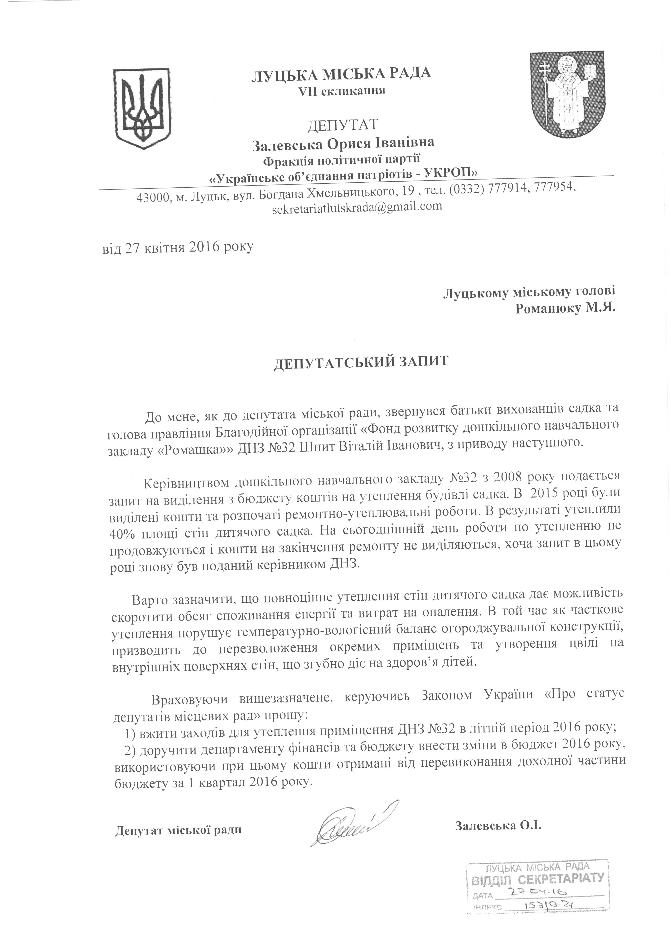 1. Підтримати запит депутата міської ради Залевської О.І. до міського голови Романюка М.Я. щодо утеплення будівлі ДНЗ № 32 (додається).
