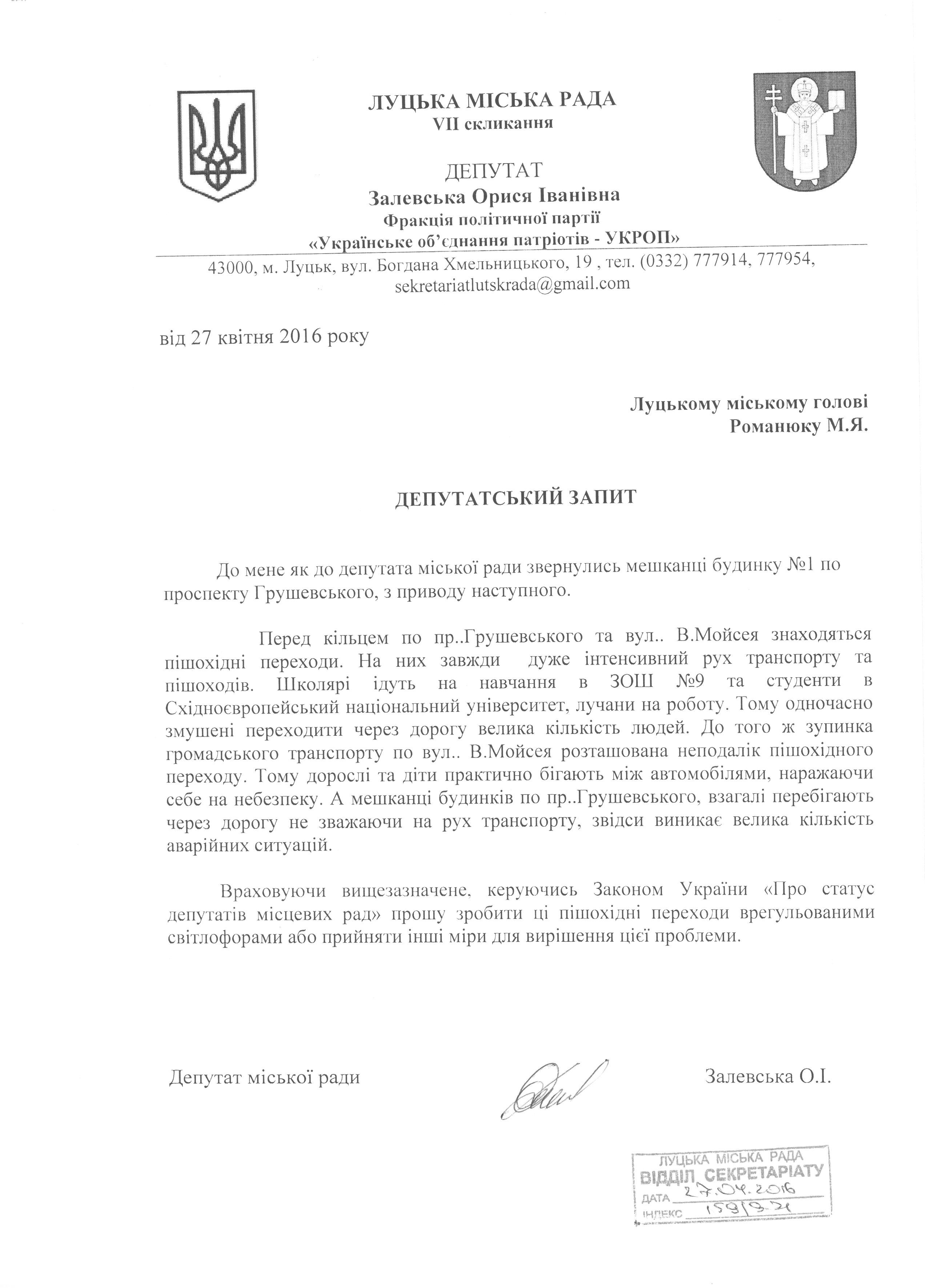 Про запит депутата міської ради Залевської О.І. щодо влаштування регульованих пішохідних переходів на проспектах Президента Грушевського та Василя Мойсея