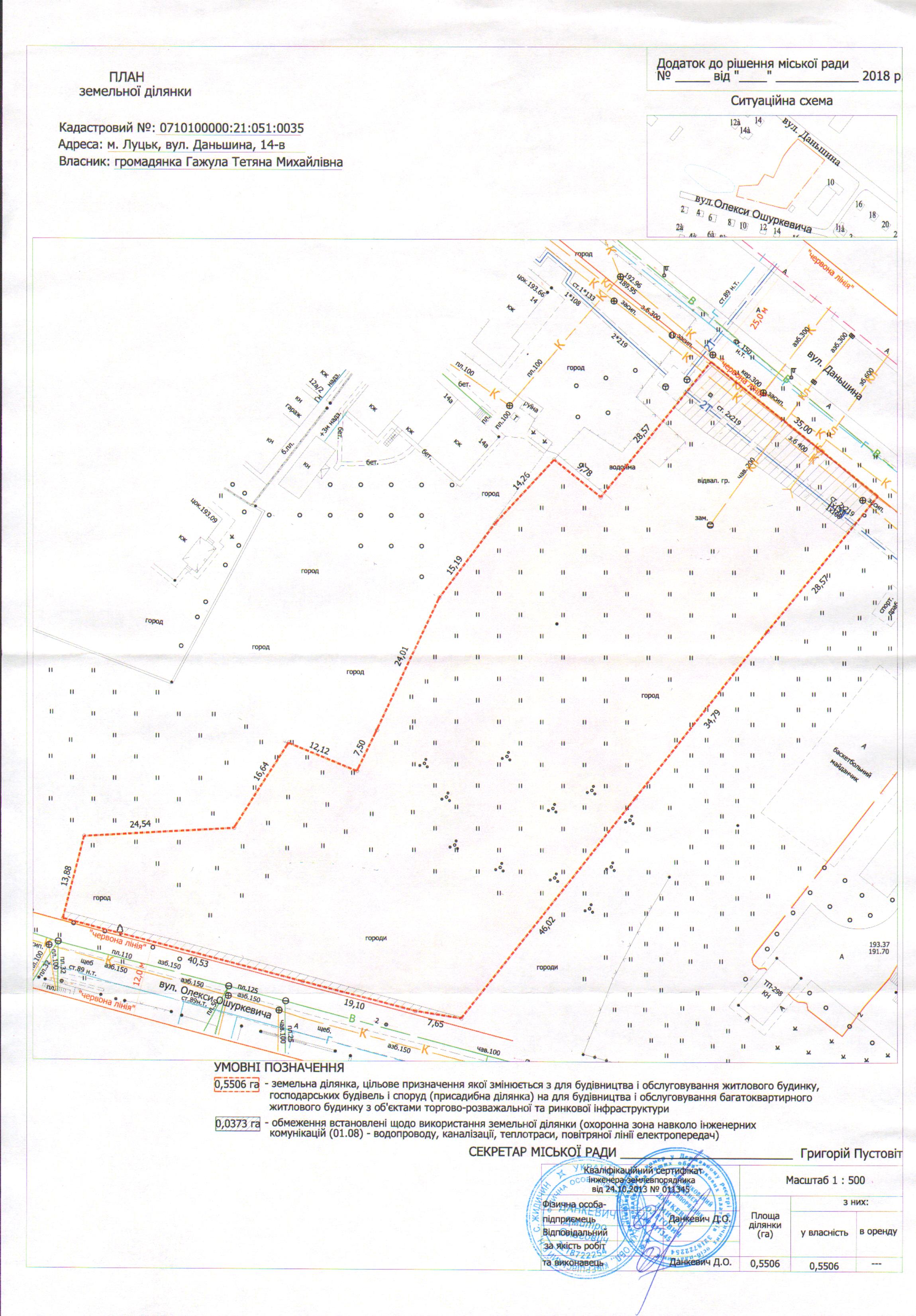 1. Затвердити громадянці Гажулі Тетяні Михайлівні проект землеустрою щодо відведення земельної ділянки (зміна цільового призначення) на вул. Даньшина, 14-в, площею 0,5506 га, кадастровим номером 0710100000:21:051:0035 для будівництва і обслуговування багатоквартирного житлового будинку з об’єктами торгово-розважальної та ринкової інфраструктури на вул. Даньшина, 14-в.