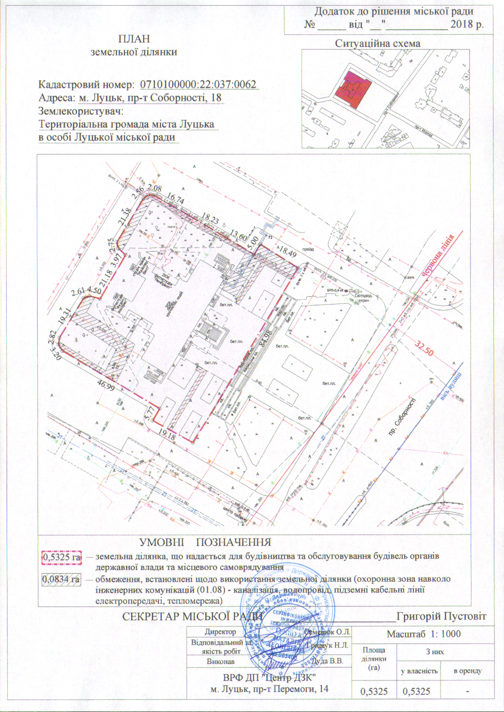 2. Зареєструвати за територіальною громадою міста Луцька в особі Луцької міської ради право комунальної власності на земельну ділянку комунальної власності на проспекті Соборності, 18 площею 0,5325 га, кадастровим номером 0710100000:22:037:0062, для будівництва та обслуговування будівель органів державної влади та місцевого самоврядування.
