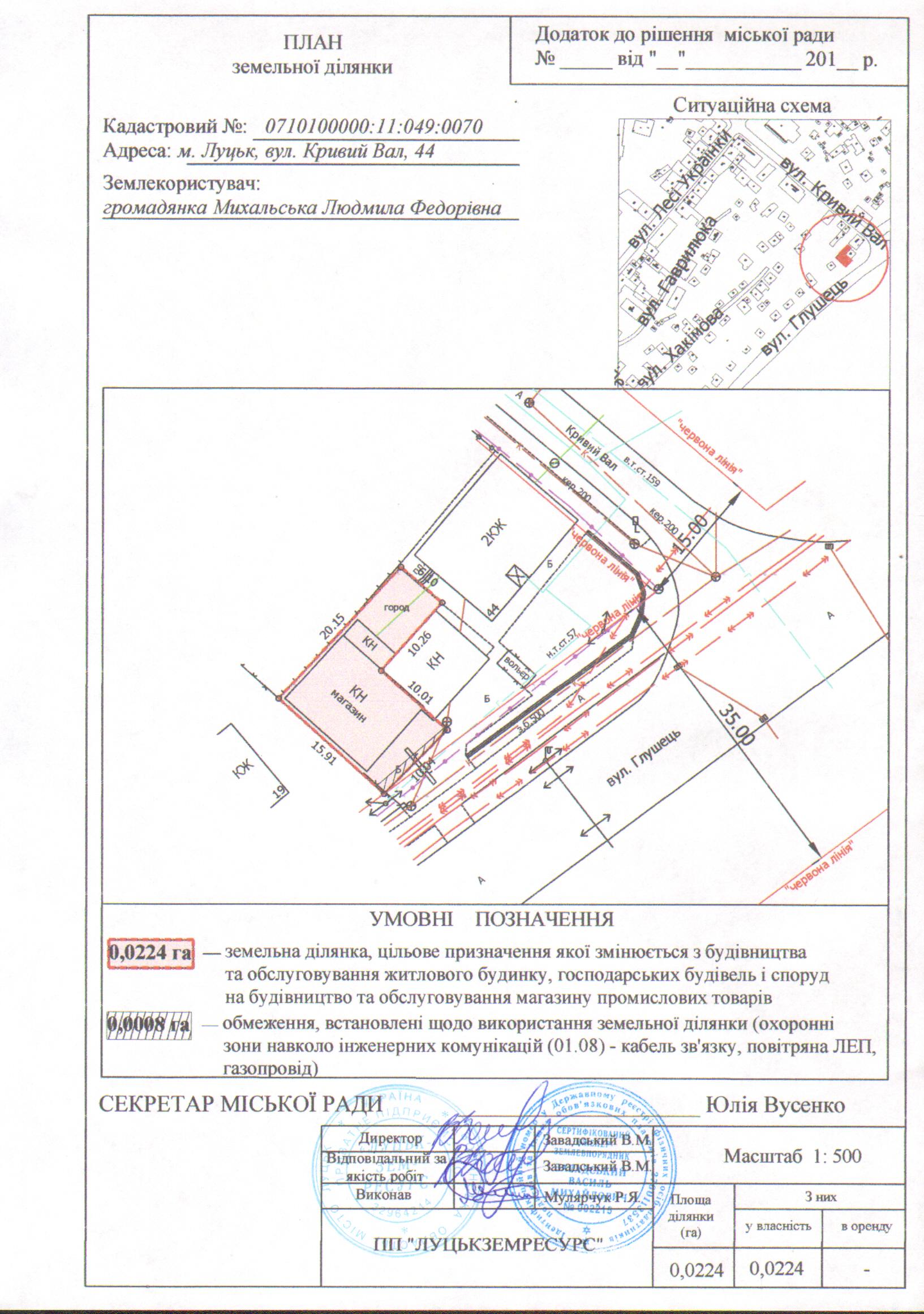 1. Затвердити громадянці Михальській Людмилі Федорівні проект землеустрою щодо відведення земельної ділянки (зміна цільового призначення) на вул. Кривий Вал, 44 площею 0,0224 га, кадастровим номером 0710100000:11:049:0070 для будівництва та обслуговування магазину промислових товарів.
