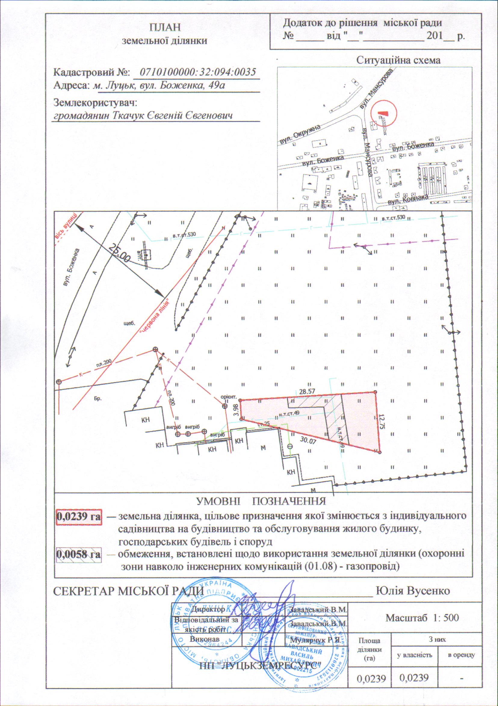 1. Затвердити громадянину Ткачуку Євгенію Євгеновичу проект землеустрою щодо відведення земельної ділянки (зміна цільового призначення) на вул. Боженка, 49а площею 0,0239 га, кадастровим номером 0710100000:32:094:0035 для будівництва та обслуговування жилого будинку, господарських будівель і споруд.