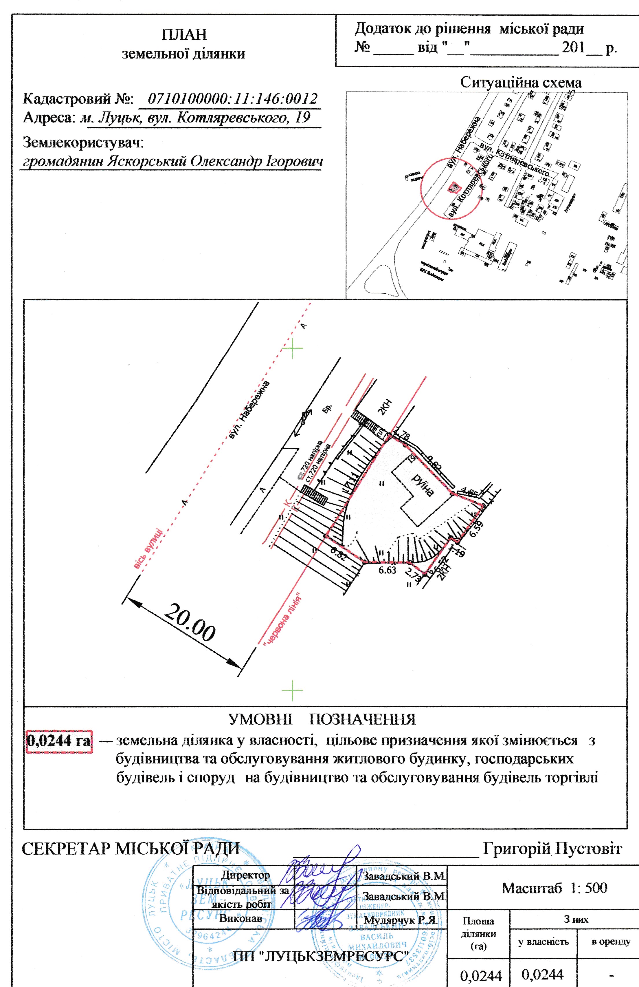 1. Затвердити громадянину Яскорському Олександру Ігоровичу проект землеустрою щодо відведення земельної ділянки (зміна цільового призначення) на вул. Котляревського, 19 площею 0,0244 га, кадастровим номером 0710100000:11:146:0012 для будівництва та обслуговування будівель торгівлі.