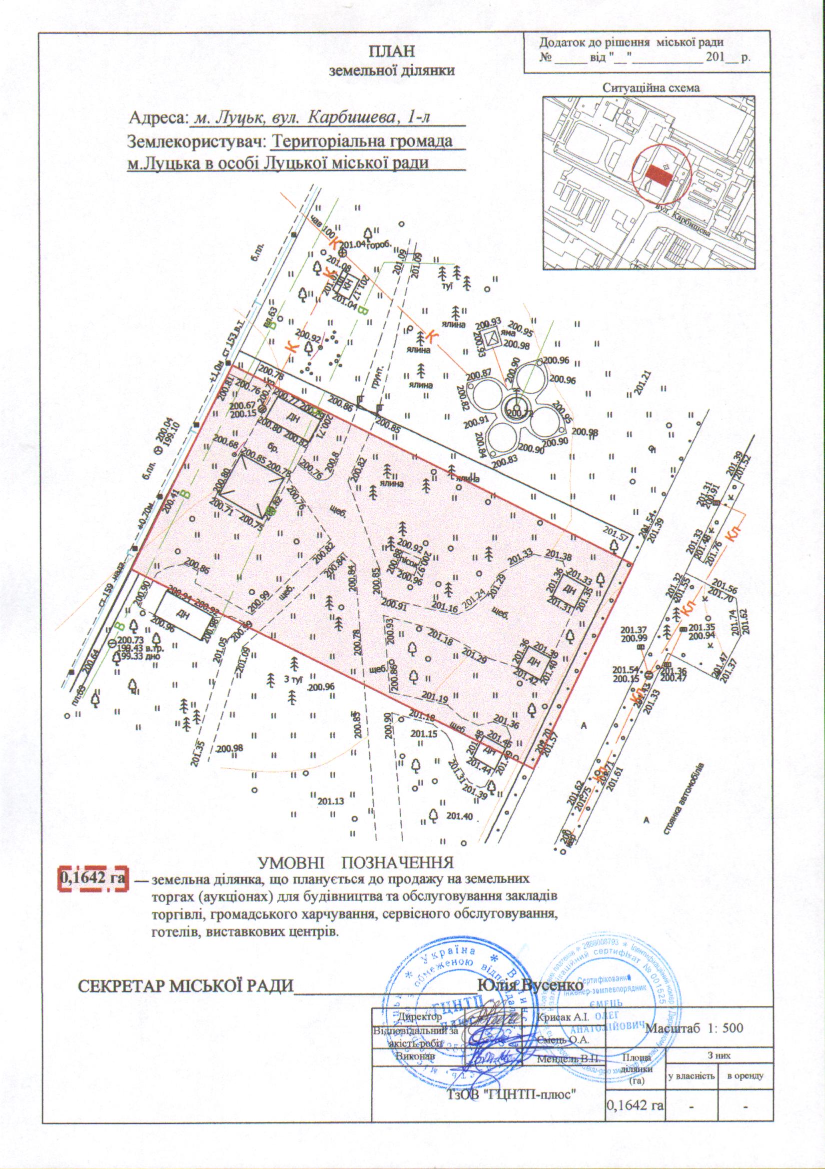 1. Затвердити територіальній громаді м. Луцька в особі Луцької міської ради проект землеустрою щодо відведення земельної ділянки комунальної власності несільськогосподарського призначення для продажу у власність на земельних торгах (аукціоні) на вул. Карбишева, 1-л, площею 0,1642 га, кадастровим номером 0710100000:42:010:0083, для будівництва та обслуговування закладів торгівлі, громадського харчування, сервісного обслуговування, готелів, виставкових центрів, згідно з додатком.