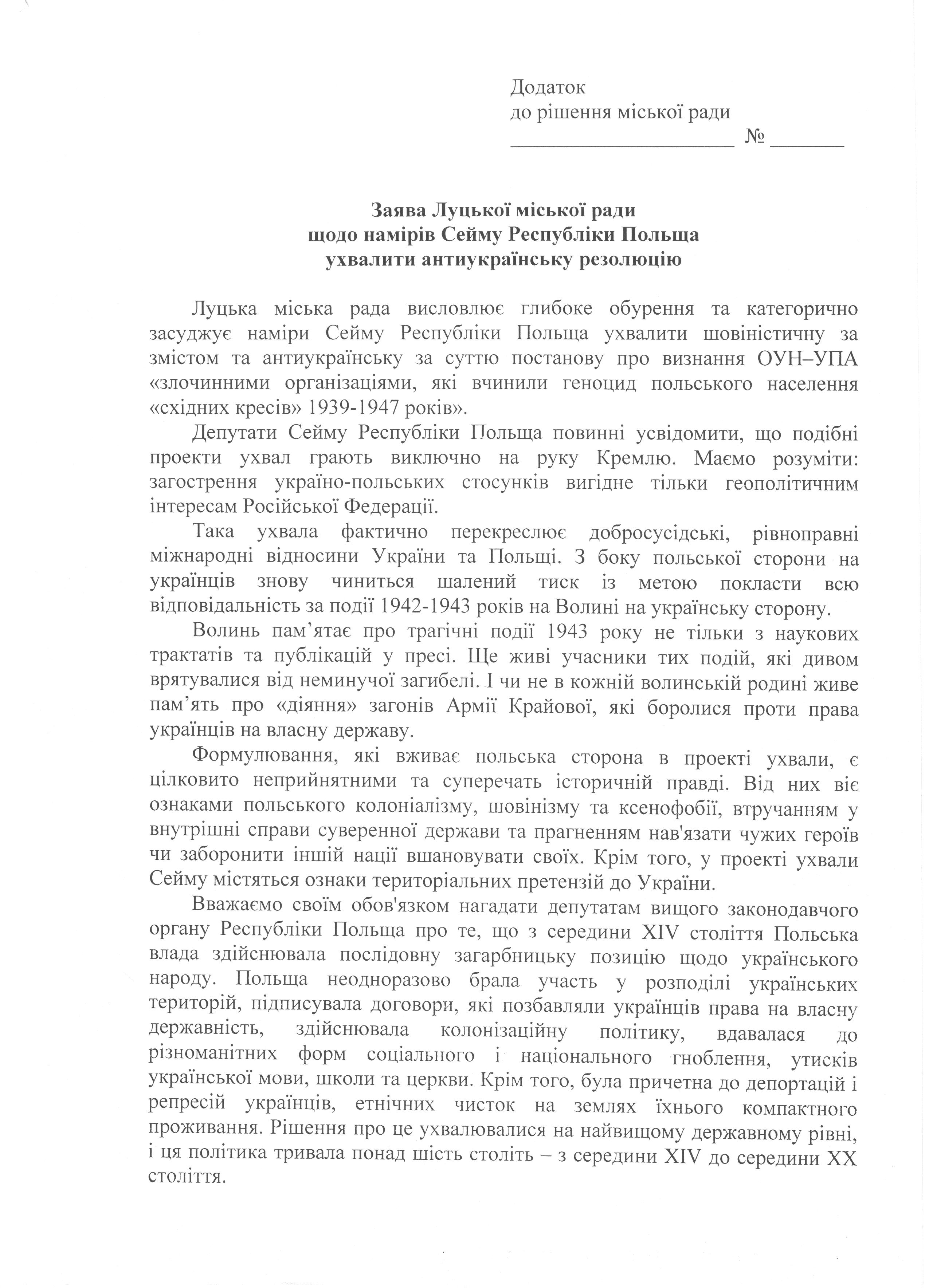 Підтримати Заяву Луцької міської ради щодо намірів Сейму Республіки Польща ухвалити антиукраїнську резолюцію (додається).