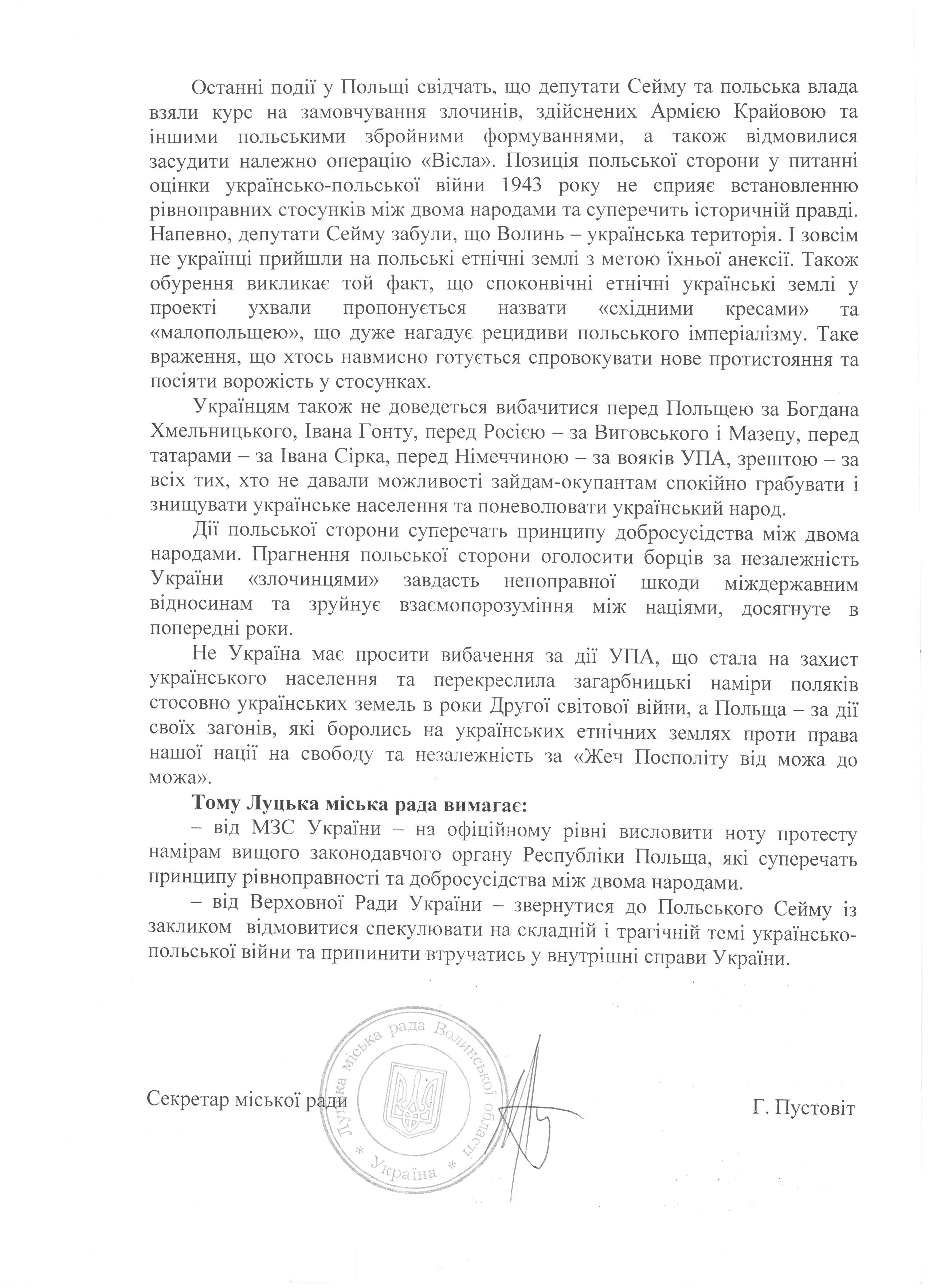 Заслухавши Заяву депутатських фракцій Луцької міської ради ВО «Свобода», ВО «Батьківщина» та ПП «Фронт змін» щодо намірів Сейму Республіки Польща ухвалити антиукраїнську резолюцію, відповідно до статті 21 Закону України «Про статус депутатів місцевих рад», міська рада