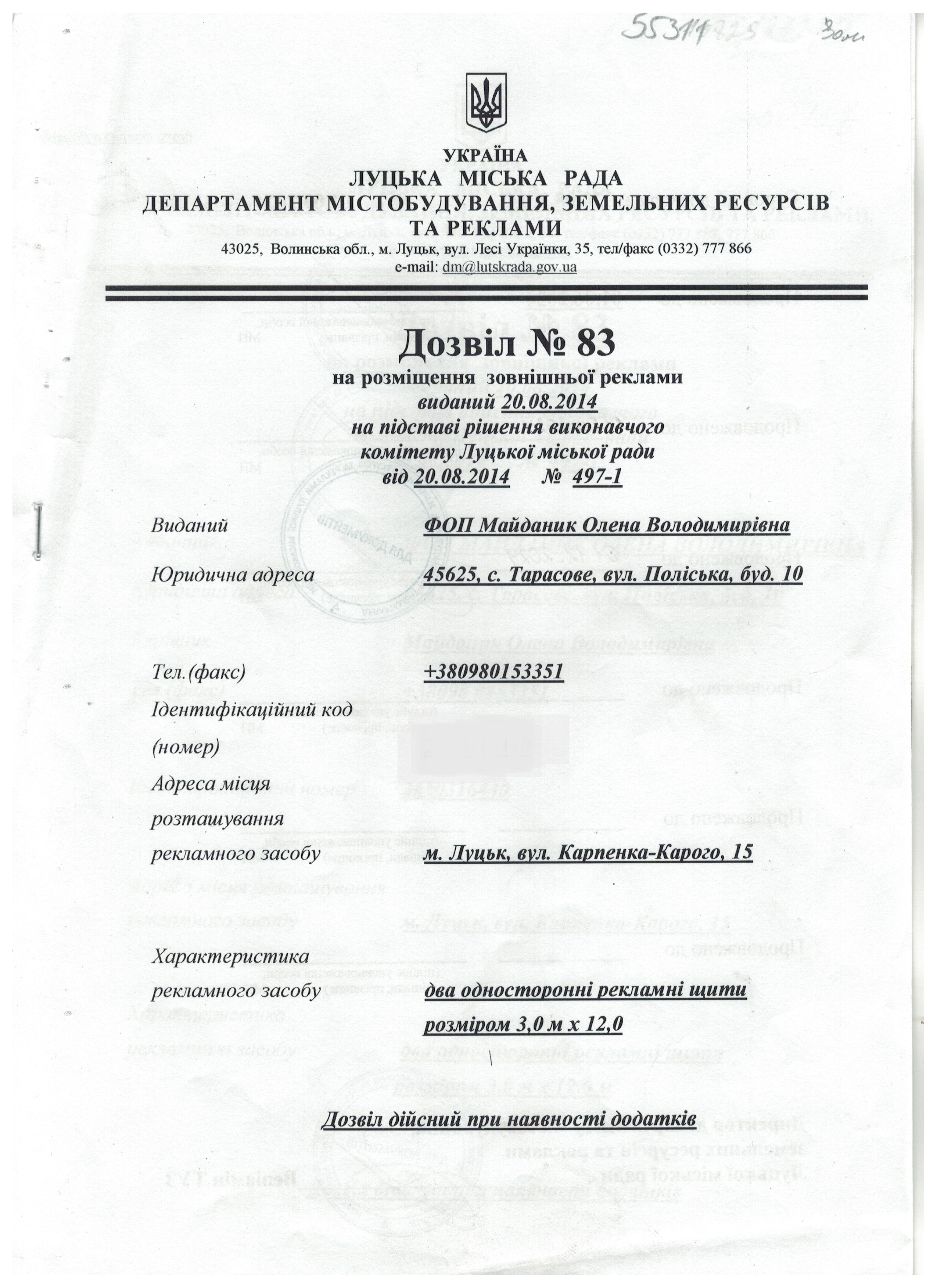 Дозвіл на розміщення зовнішньої реклами № 83 від 20.08.2014, виданий ФОП Майданик Олені Володимирівні, на вул. Карпенка-Карого, 15