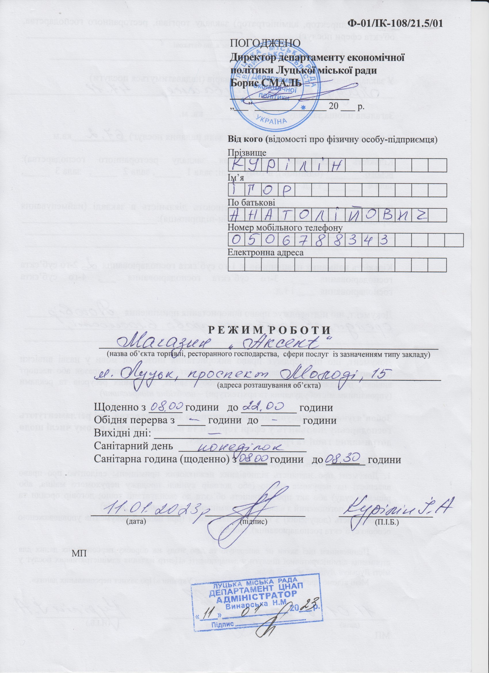 Режим роботи магазину "Akcent" на проспекті Молоді, 15