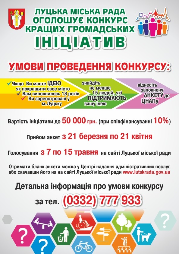 З 21.03.2016 по 21.04.2016 проводитиметься прийом анкет ініціатив у Центрі надання адміністративних послуг у місті Луцьку (вул. Лесі Українки, 35).