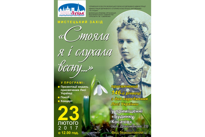 23 лютого 2017 року о 12.00 год. у приміщенні виставкового залу Адміністрації державного історико-культурного заповідника у м. Луцьку (вул. Драгоманова, 23) відбудеться мистецький захід "Стояла я і слухала весну...", приурочений 146-й річниці з дня народження Лесі Українки.