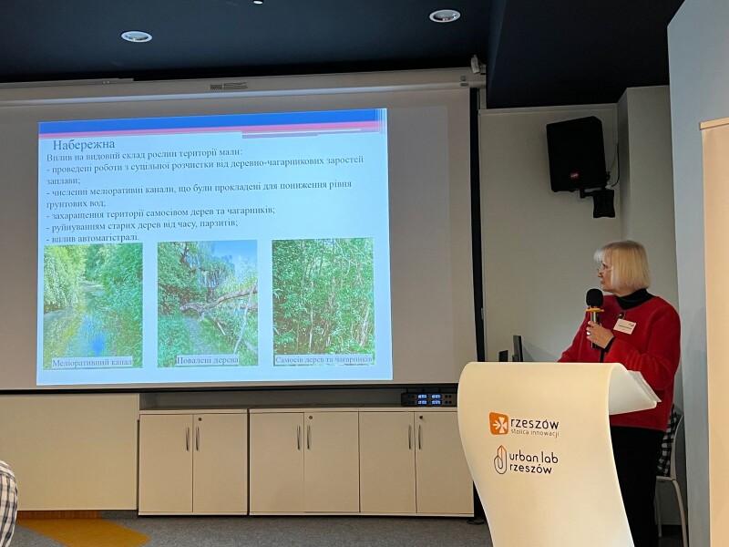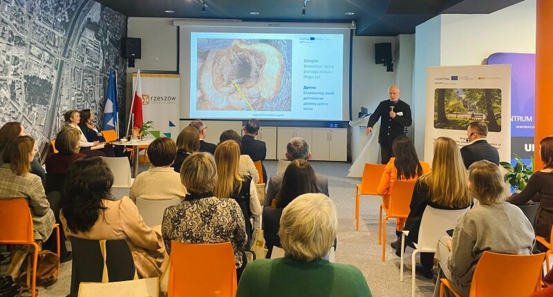 Після українських доповідачів з презентаціями виступали представники Гміни місто Жешув. Магдалена Вілановська-Гаврон із Відділу клімату та середовища поділилася досвідом реалізації природоохоронних та освітніх заходів у межах проєкту «Дике життя у великому місті: захист і промоція дикої природи й біорізноманіття в Луцьку та Жешуві», показавши, як екологічна освіта може змінювати ставлення мешканців до дикої природи в місті. Катажина Стройна презентувала підходи Жешува до зеленої трансформації міського простору та інтеграції екологічних рішень у міську політику. Матеуш Кендзьор, інспектор Управління міської зелені, поділився практичними основами інспекції дерев, розповівши про методи оцінювання їхнього стану та безпеки. Аніта Порадовська, доктор наук, зосередилася на проблемі інвазійних рослин та їхньому впливі на міські екосистеми. Д-р інж. Пйотр Тишко-Хмеловець представив комплексний підхід до догляду за віковими деревами, пояснивши особливості їх діагностики та збереження. На завершення д-р інж. арх. Анна Солтисік поділилася досвідом проєктування кишенькових парків у Кракові, зокрема розповіла про роль малої архітектури та поділ функціональних зон у створенні сучасних, екологічно збалансованих міських просторів.