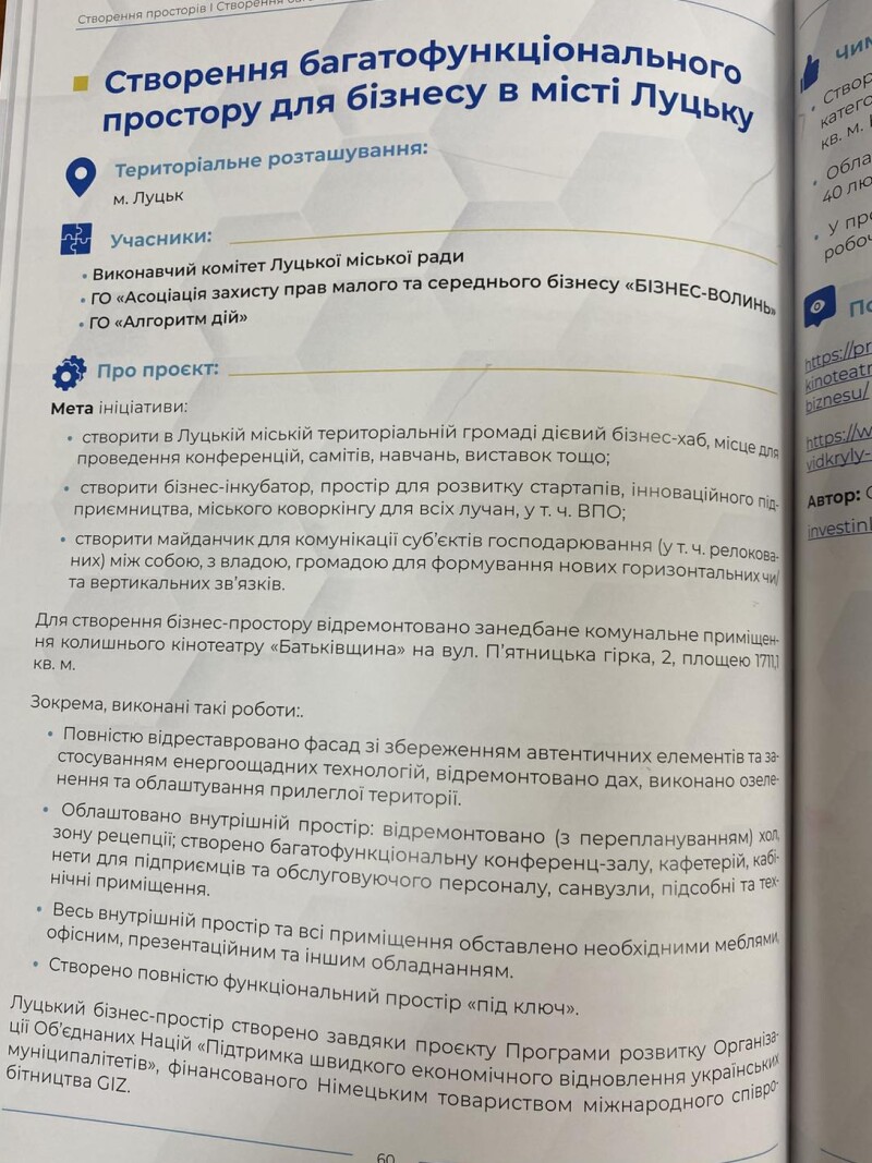 «Створення багатофункціонального простору для бізнесу в місті Луцьку» - це флагманський проєкт трансформації колишнього кінотеатру «Батьківщина» у сучасний бізнес-хаб площею понад 1700 кв. м. Завдяки підтримці Програми розвитку ООН та фінансуванню уряду Німеччини через GIZ, громада отримала унікальний простір «під ключ». Сьогодні це не просто відреставрована пам’ятка архітектури, а потужний центр із коворкінгом, конференц-залами та великою залою на 400 осіб, де народжуються нові бізнес-ідеї та гартується міцна екосистема взаємодії між активною громадою, владою та бізнесом.