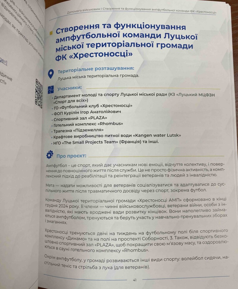 «Створення та функціонування ампфутбольної команди Луцької міської територіальної громади ФК “Хрестоносці”» - проєкт спрямований на фізичну та психологічну реабілітацію людей з ампутаціями. Створення ампфутбольної команди ФК «Хрестоносці» стало символом незламності духу. Це приклад того, як через спорт громада вибудовує інклюзивне середовище та надає рівні можливості для самореалізації кожного жителя..