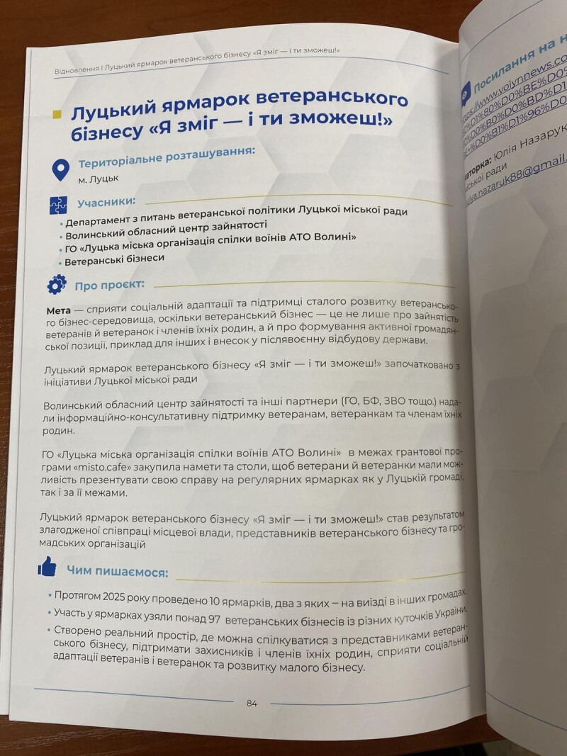Ініціативи Луцької міської ради «Створення багатофункціонального простору для бізнесу в місті Луцьку», «Луцький ярмарок ветеранського бізнесу “Я зміг – і ти зможеш!”», «Створення та функціонування ампфутбольної команди Луцької міської територіальної громади ФК “Хрестоносці”» увійшли до V ювілейного збірника «Громадянське суспільство, бізнес та влада – кращі практики співпраці».