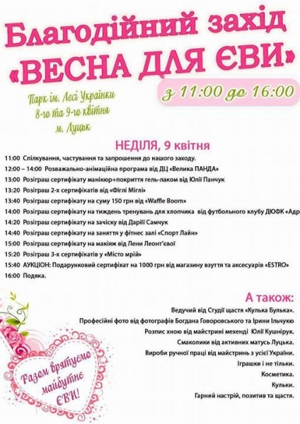 Лучан та гостей міста запрошують на благодійний захід заради порятунку життя маленької волиняночки, Єви Марчук, що буде проходити 8-9 квітня в центральному парку імені Лесі Українки з 11:00 до 16:00.