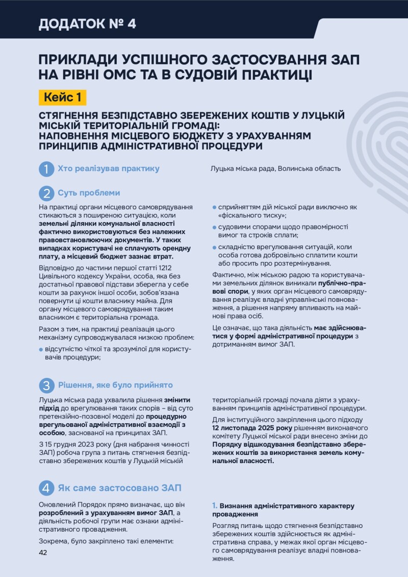 Під час круглого столу представлено Звіт про виконання Закону України «Про адміністративну процедуру», в якому окремо відзначено практику Луцької міської ради як приклад успішного застосування ЗАП на рівні органів місцевого самоврядування. Зокрема, у Звіті наведено кейс Луцької міської територіальної громади щодо стягнення безпідставно збережених коштів за використання земель комунальної власності з урахуванням принципів адміністративної процедури.