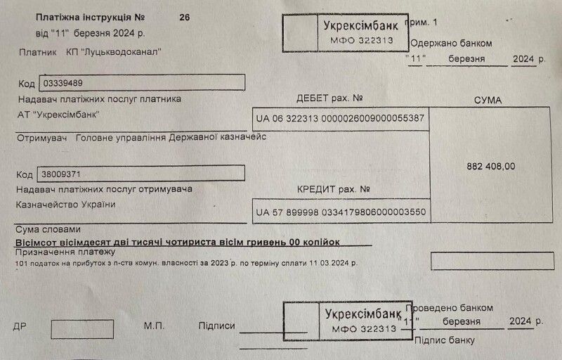 Березень не став винятком. Попри непростий час, враховуючи, що в 2023 році підприємство мало збитковий тариф, коли НКРЕКП встановило економічно-необґрунтований тариф на водопостачання для населення, «Луцькводоканал» нарахував податок на прибуток і перерахував у бюджет Луцької громади - майже 900 тисяч гривень.
