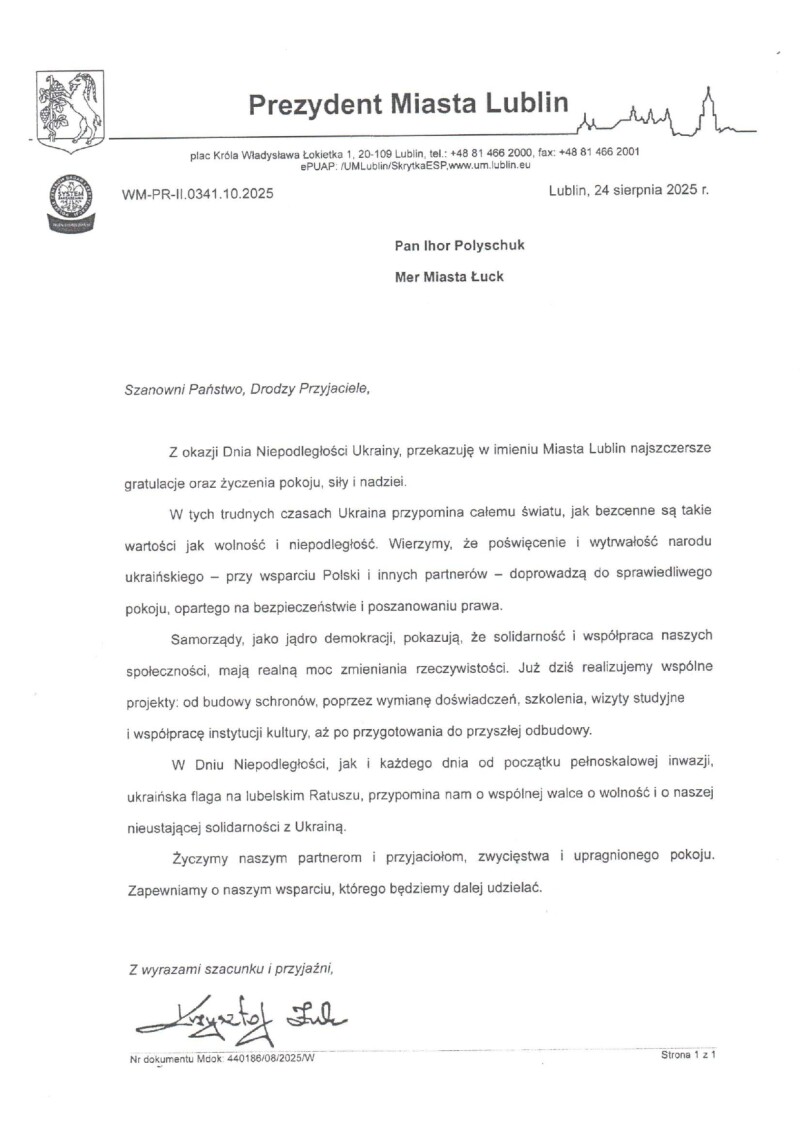 «Передаю найщиріші вітання та побажання миру, сили й надії. У ці важкі часи Україна нагадує всьому світові, наскільки безцінними є свобода і незалежність. Ми віримо, що жертовність і витримка українського народу за підтримки Польщі та інших партнерів приведуть до справедливого миру, заснованого на безпеці та повазі до права. Органи місцевого самоврядування, як осердя демократії, показують, що солідарність і співпраця наших громад мають реальну силу змінювати дійсність. Уже сьогодні ми реалізуємо спільні проєкти: від будівництва укриттів, обміну досвідом, навчальних візитів і співпраці культурних інституцій — аж до підготовки до майбутньої відбудови. У День Незалежності, як і щодня від початку повномасштабного вторгнення, український прапор на люблінській Ратуші нагадує нам про спільну боротьбу за свободу та про нашу незмінну солідарність з Україною. Запевняємо у нашій підтримці, яку ми й надалі будемо надавати», - зазначив у вітанні Президент міста Люблін Кшиштоф Жук та побажав перемоги та омріяного миру.