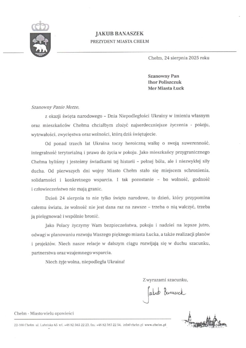 “Вже понад три роки Україна веде героїчну боротьбу за свою суверенність, територіальну цілісність і право жити у мирі. Як мешканці прикордонного Хелма ми були й залишаємося свідками цієї історії — сповненої болю, але й надзвичайної сили духу. З перших днів війни місто Хелм стало місцем прихистку, солідарності та конкретної підтримки. І так буде й надалі — бо свобода, гідність і людяність не мають кордонів. День 24 серпня - це не лише національне свято, а й день, який нагадує всьому світові, що свобода не дається раз і назавжди, за неї треба боротися, її потрібно плекати й спільно захищати. Як поляки, ми бажаємо вам безпеки, миру й надії на краще завтра, відваги у плануванні розвитку вашого прекрасного міста Луцька, а також у реалізації планів і проєктів міста. Нехай наші відносини й надалі розвиваються у дусі поваги, партнерства та взаємної підтримки. Хай живе вільна, незалежна Україна!», - зазначив він у вітанні.