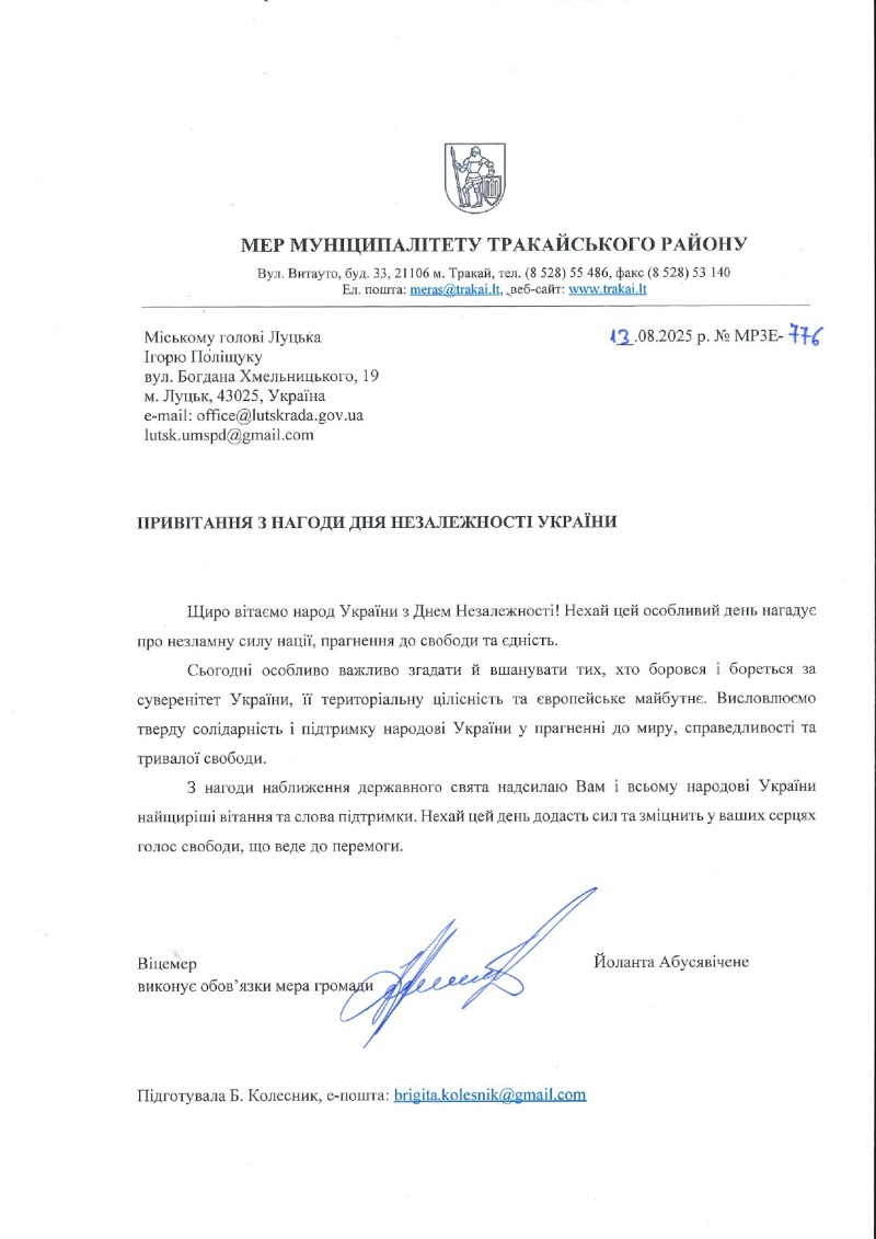 Віцемер Муніципалітету Тракайського району Йоланта Абусявічене у вітальному листі висловила солідарність і підтримку народові України у прагненні до миру, справедливості та тривалої свободи. «Особливо важливо згадати та вшанувати тих, хто боровся і бореться за суверенітет України, її територіальну цілісність та європейське майбутнє. Нехай цей день додасть сил та зміцнить у ваших серцях голос свободи, що веде до перемоги», - побажала вона.
