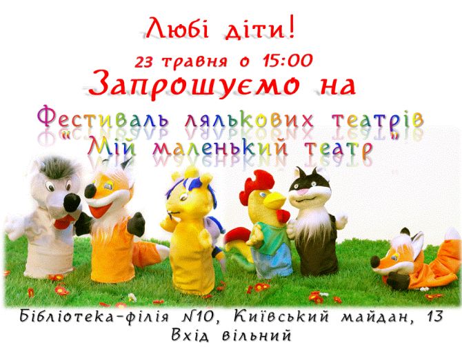 Сьогодні, 23 травня 2017 року у приміщенні бібліотеки-філії №10 (вул.Київський майдан, 13) відбудеться відкриття мандрівного фестивалю лялькових гуртків бібліотек «Мій маленький театр». Нові вистави представлять лялькові гуртки «Соняшник» центральної бібліотеки для дітей, «Усмішка» бібліотеки-філії №2 для дітей, «Буратіно» бібліотеки-філії №3 для дітей, «Котигорошко» філії №10 для дорослих та «Дзвіночок» бібліотеки-філії №5 для дорослих. Присутні матимуть нагоду переглянути лялькові вистави «Хоробрий заєць», «Коза-дереза», «Пригоди Насті в казковій країні», «Вогнехвостик», «Євробачення Enimals», взяти участь у літературних вікторинах.