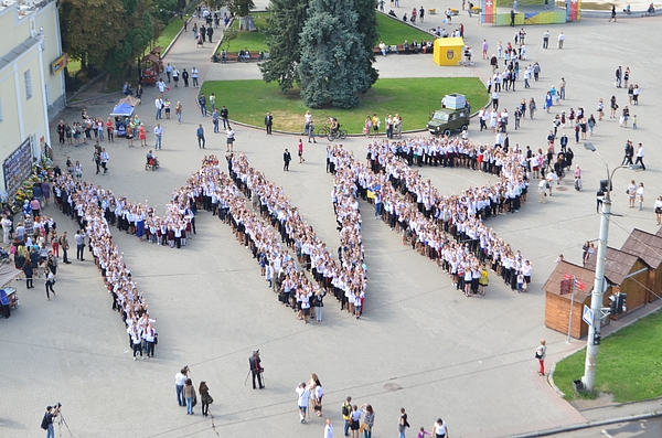 Сьогодні на Театральний майдан обласного центру прийшло більше тисячі учнів загальноосвітніх шкіл міста, щоб засвідчити свою патріотичну позицію, взяти участь у громадській акції «Українська вишиванка». Вони вишикувалися у таке жадане для кожного українця слово «МИР». При цьому діти скандували: «Слава Україні! Героям слава!».