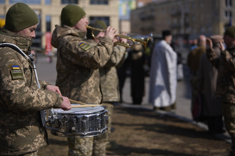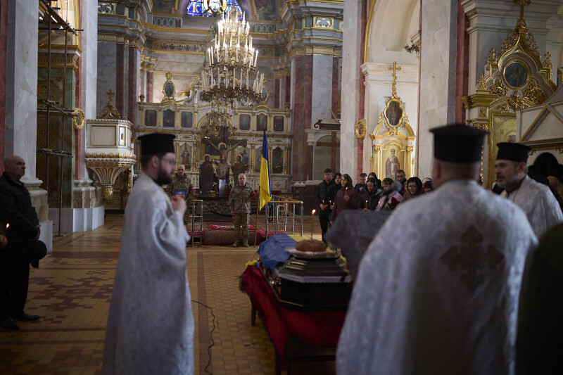Після завершення заупокійного богослужіння труну з тілом захисника пронесли Театральним майданом. Біля Пам'ятного фотостенду загиблим Героям траурна процесія зупинилася і виконала Державний Гімн.