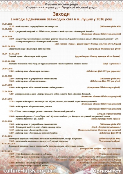 План заходів, що відбуватимуться в закладах культури з нагоди відзначення Великодніх свят в м. Луцьку у 2016 році