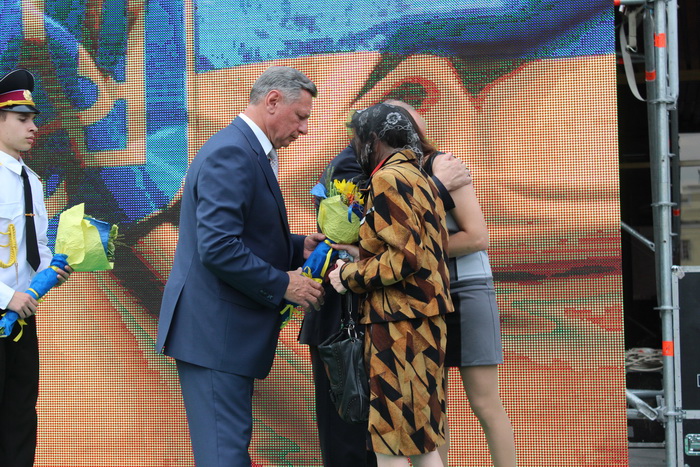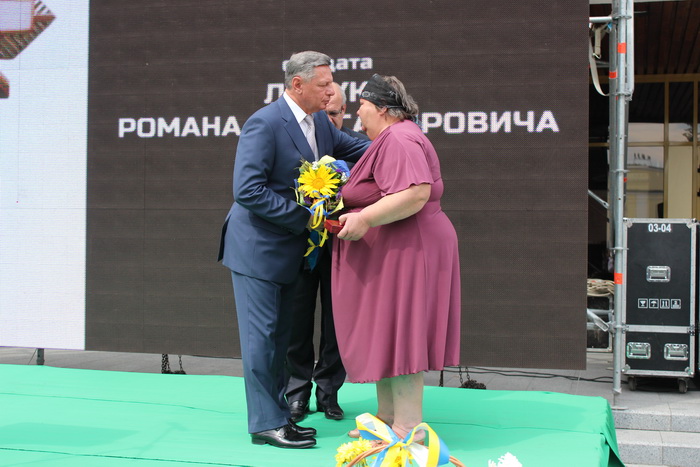 Також голова облдержадміністрації Володимир Гунчик та міський голова Микола Романюк вручили квіти присутнім рідним військовослужбовців – лучан, які загинули на сході України, та вже отримали державні нагороди: