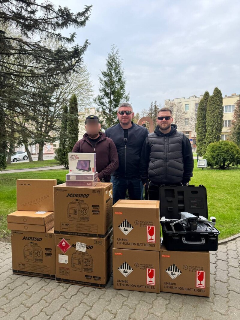 А для військової частини А7028 передали три супутникові модеми Starlink Internet Satellite Mini, три інверторні генератори Maxpeedingrods MXR3500, три зарядні станції Oukitel P100E Plus 1800, три планшети LENOVO Idea Tab 8 та квадрокоптер AUTEL EVO MAX 4N.