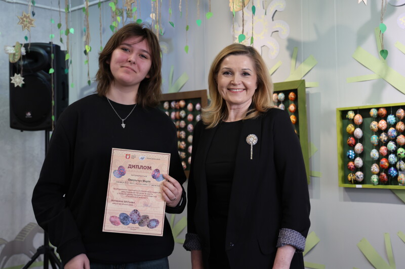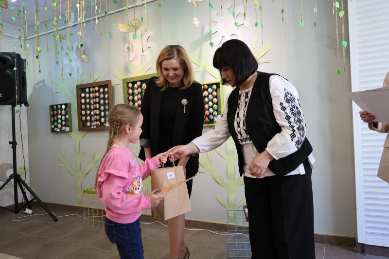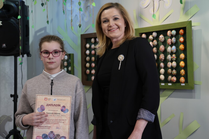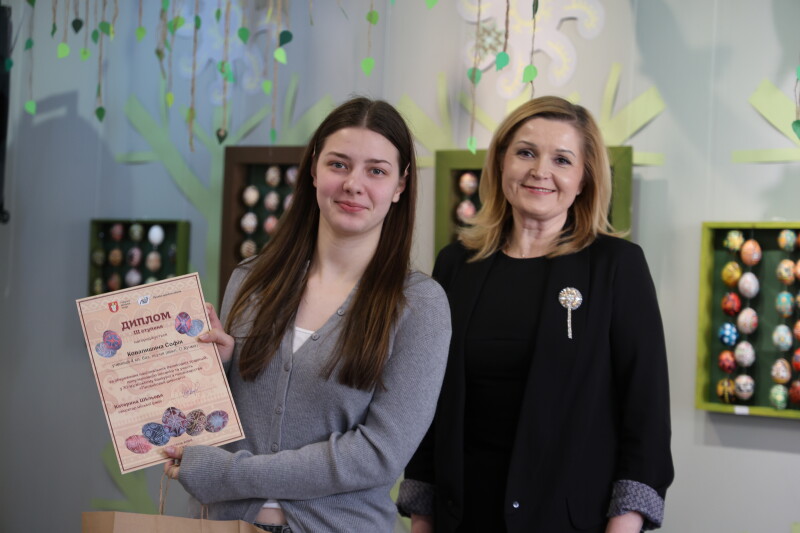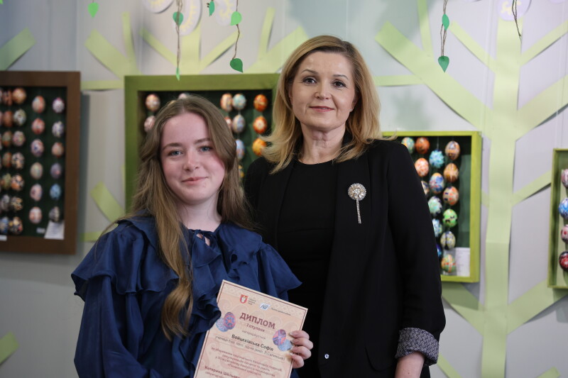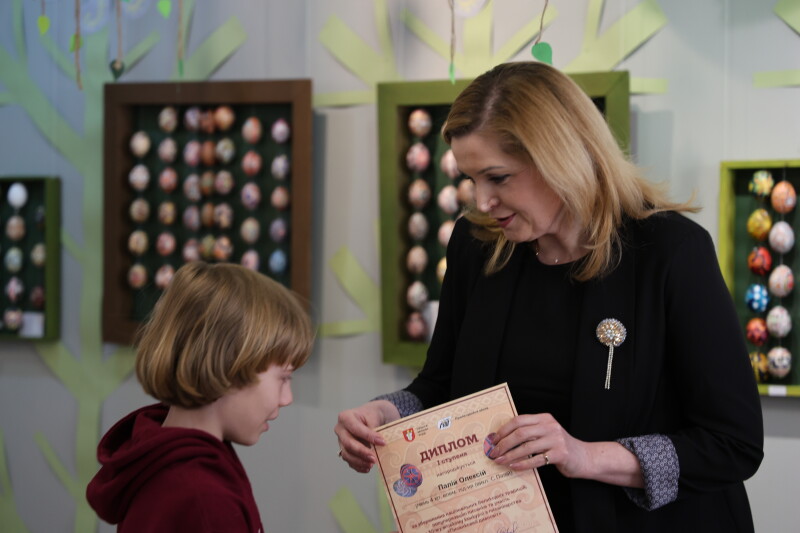Ірина Чебелюк та директор департаменту культури Тетяна Гнатів вручили переможцям і лауреатам виставки-конкурсу подяки Луцької міської ради та подарунки. Адже цьогорічна експозиція - ювілейна, 30-та за рахунком. Загалом упродовж десятиліть у шкільному творчому змаганні взяли участь 6000 школярів, які розписали близько 23 600 писанок.