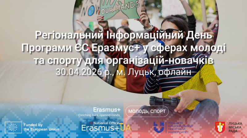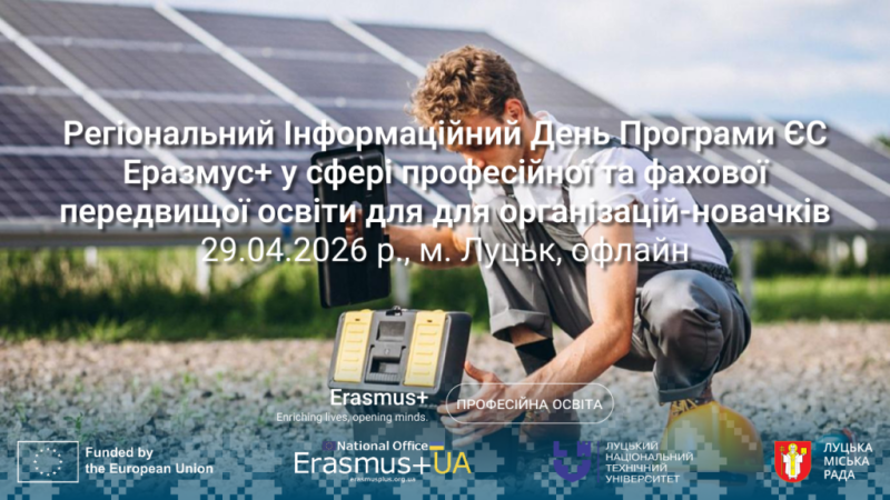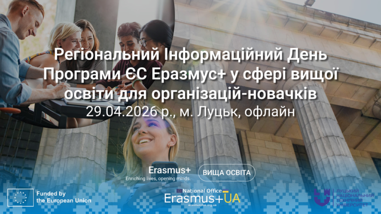 Національний Еразмус+ офіс в Україні спільно з Представництвом ЄС в Україні, Міністерством освіти і науки України, Луцьким національним технічним університетом, департаментом освіти та управлінням міжнародного співробітництва та проектної діяльності Луцької міської ради запрошують приєднатися до Регіонального інформаційного дня Програми ЄС Еразмус+, що відбудеться протягом 29-30 квітня 2026 року у сферах: