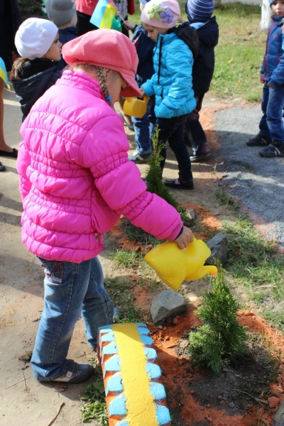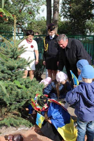 Сьогодні відкрили скверик миру, у якому висаджені хризантеми, шаровидні, клоновидні туї та срібні ялинки. Також у скверику встановили лавки. Діти разом із міським головою перерізали символічну стрічку, пустили в небо голубів та жовті і сині кульки.