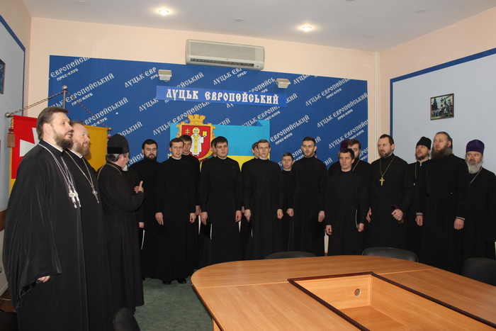 Світла доброзичлива атмосфера Різдвяних свят наповнила наше місто. Cьогодні робочий день у Луцькій міській раді розпочався з новорічно-різдвяних віншувань. Священнослужителі Української Православної Церкви виконали духовні піснеспіви, у яких прославляли народження Ісуса Христа, та привітали керівників міста і працівників виконавчих органів. Протоієрей Микола Бондарук висловив найщиріші вітання міському голові Миколі Романюку, його заступникам, працівникам міської ради та громаді міста від себе та керуючого Волинської Єпархії УПЦ Митрополита Ніфонта.