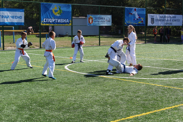 У перервах між естафетами присутні мали можливість насолоджуватися показовими виступами гуртківців навчального закладу з художньої гімнастики та бойових мистецтв.