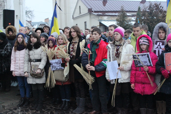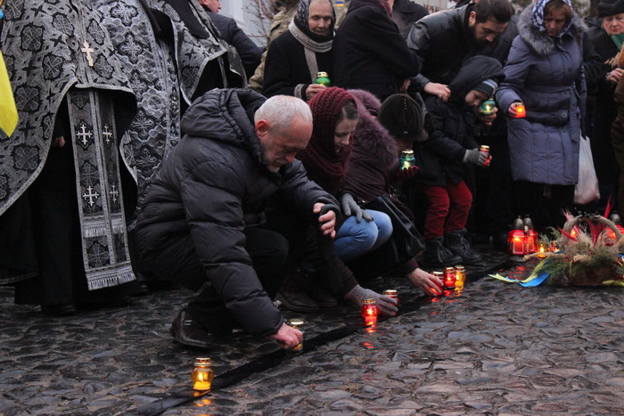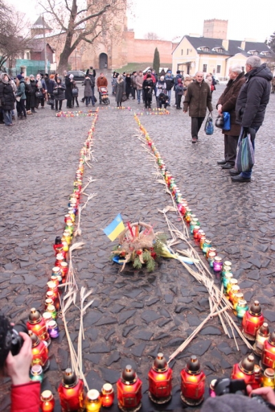 На Замковій площі свічечками та лампадками, скорботними композиціями із колосків пшениці виклали символічний хрест. Мерехтять у ньому вогники — наші пам'ять та співчуття.