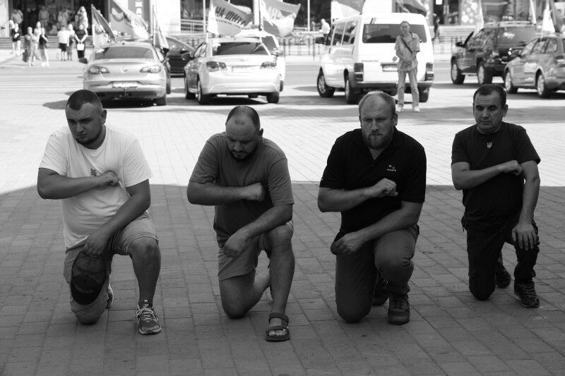 Після завершення богослужіння труну з тілом покійного захисника пронесли Театральним майданом. Біля пам’ятного фотостенду “Герої Небесної Сотні – Загинули за Єдність України” присутні зупинилися і виконали Державний Гімн України.