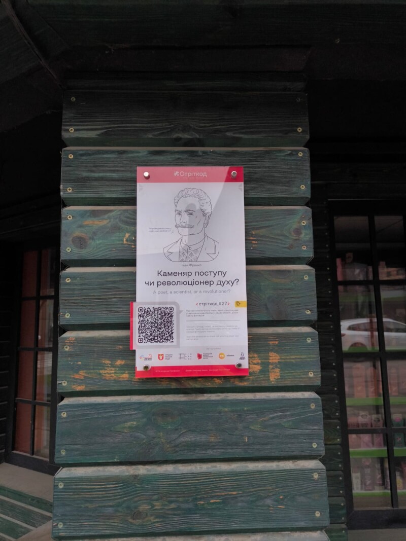 «Стріткод: історія на кожному кроці» - це інтерактивна онлайн платформа про українських історичних постатей, де в одному місці зібрана вся інформація про людину чи історичну подію. Фізично - це інформаційні таблиці з QR-кодом, які вбудовані в міський простір.