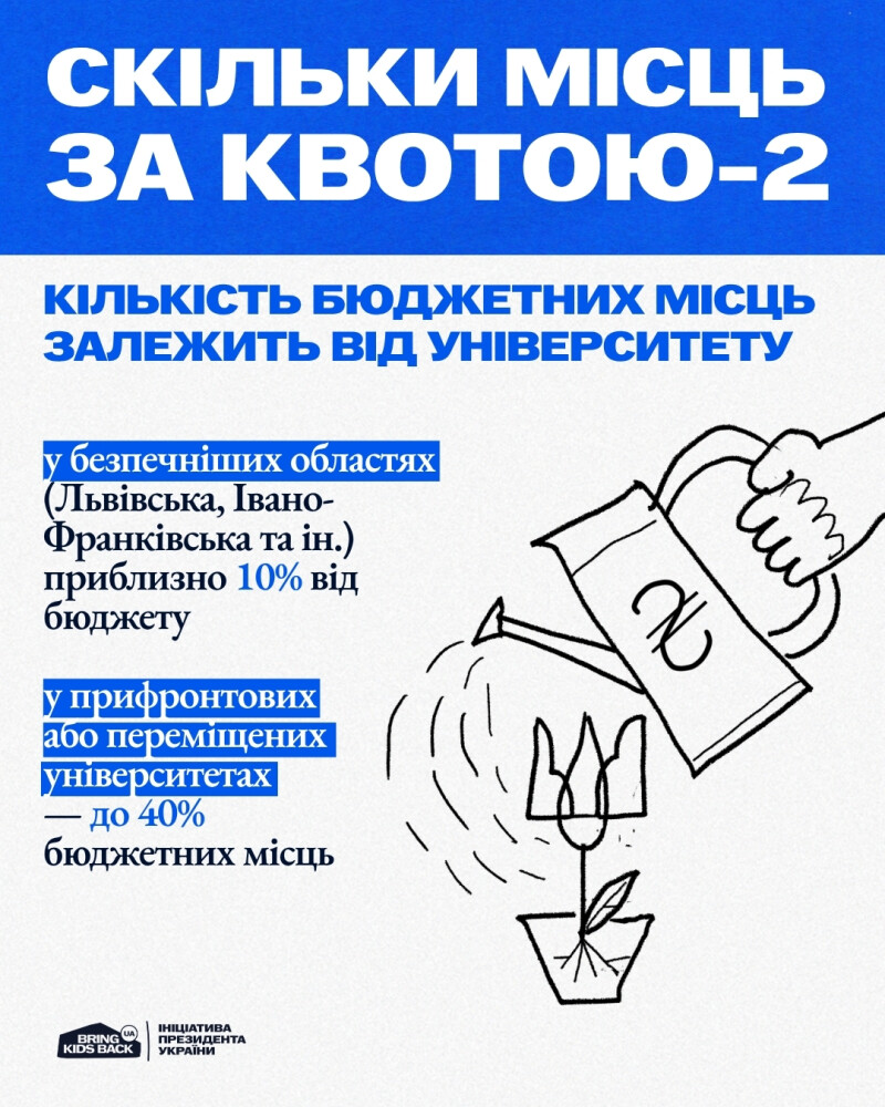 Квота-2 — це окремі бюджетні місця для вступників з ТОТ і територій активних бойових дій. Вступ відбувається в окремому конкурсі, що дає більше шансів отримати бюджет. У більшості університетів це близько 10% місць, а в переміщених або прифронтових — до 40%.