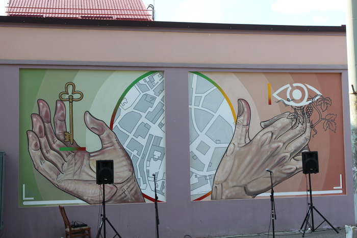 Автор зображення, відомий мураліст Сергій Радкевич розповів, що зображення складне, наповнене глибоким змістом та численними символами. Дві символічні долоні єднають два дружні міста.