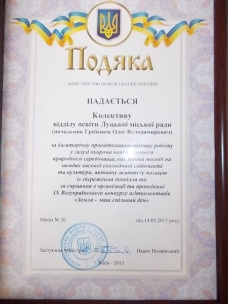 Міністерством освіти та науки України відзначено колектив управління освіти Луцької міської ради (начальник Гребенюк О.В.) за багаторічну просвітницько-виховну роботу у галузі охорони навколишнього природного середовища, виховання молоді на засадах високої екологічної свідомості та культури, активну життєву позицію із збереження довкілля та за сприяння в організації та проведенні ІХ Всеукраїнського конкурсу агітколективів “Земля наш спільний дім”.