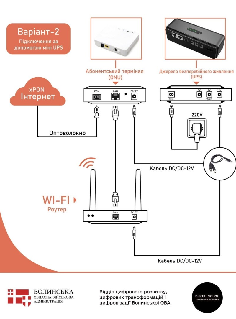 Команда Цифрова Волинь підготувала для вас інфографіку про те, як «заживити» Wi-Fi роутер за допомогою павербанку або джерела безперебійного живлення UPS.