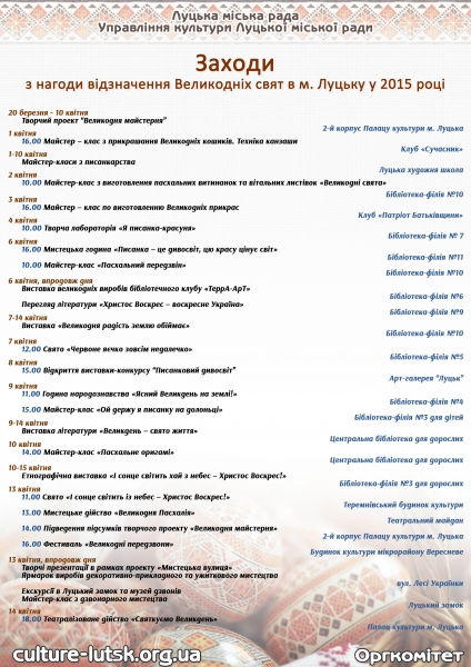 Щороку напередодні Великодня та у святкові дні для лучан та гостей міста організовується багато цікавих заходів та подій. Мешканці з радістю беруть участь у різноманітних забавах, виставках та ярмарках. Цей рік не став винятком.