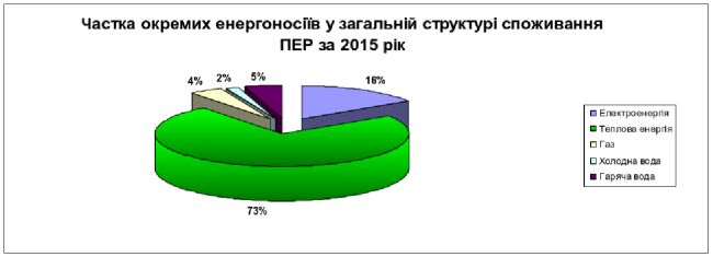 Основною статтею витрат за енергоносії у бюджетних установах та закладах у 2015 році була теплова енергія (73 % від усіх енергоносіїв).